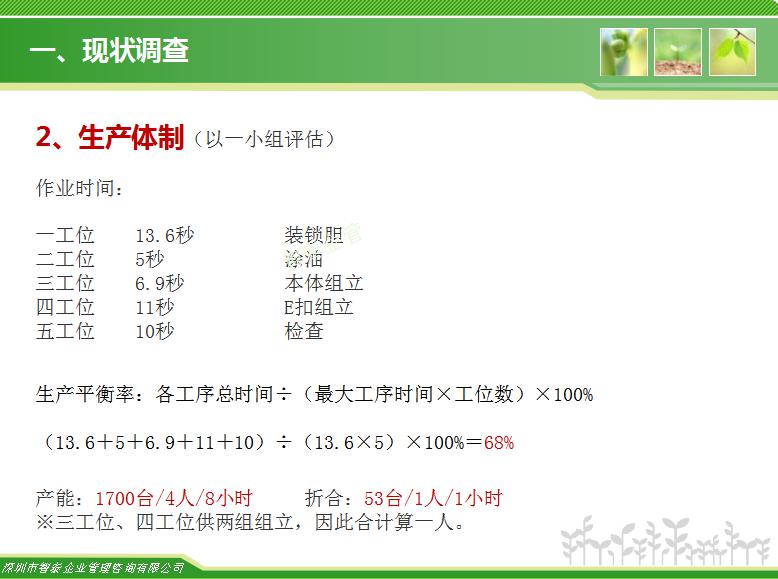 在精益生產(chǎn)中車間經(jīng)常要改進的內(nèi)容是生產(chǎn)線上的生產(chǎn)平衡率問題,目前國內(nèi)加工型企業(yè)的生產(chǎn)平衡率只有65%左右,對于智泰專業(yè)團隊來說,這里面的改善空間巨大,通過智泰人的努力,在企業(yè)推進生產(chǎn)平衡率平均提升到85%以上,階段為生產(chǎn)效率提升案例,請查閱: