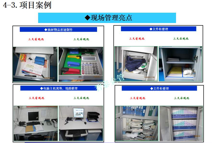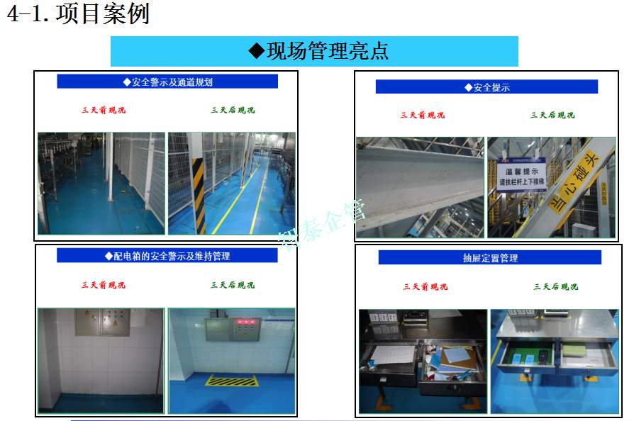 智泰咨詢下屬的5S管理公司首創(chuàng)的產(chǎn)品三天一標桿,三天一條線,三天締造6~8個標桿車間,智泰咨詢專業(yè)的顧問團隊為企業(yè)的5S管理快速打造已形成一套標準化內(nèi)容。