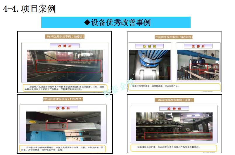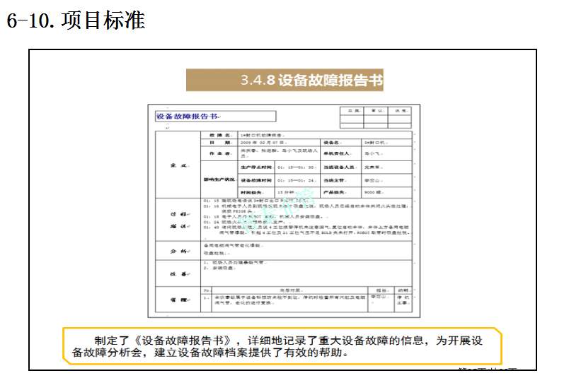 智泰咨詢下屬的TPM咨詢公司為企業(yè)推進的TPM管理活動中,為企業(yè)設(shè)備故障率下降推進了大量的制度及標準,通過TPM全員參與活動,消除設(shè)備的缺陷并改善及復原,并對設(shè)備進行部分改良,促進設(shè)備長期穩(wěn)定運行,提高設(shè)備生產(chǎn)綜合效率,附件為智泰咨詢專業(yè)團隊在某企業(yè)推進的TPM管理實錄,請查閱: