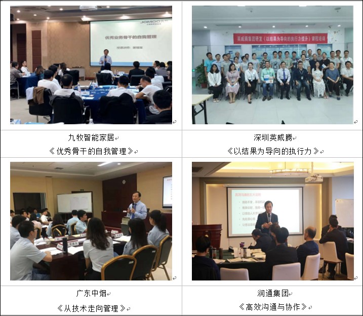 ★為家居建材十大壁紙品牌之一的浙江科翔壁紙講授《管理者核心技能提升》、《高效執(zhí)行力》、《自我管理》、《員工職業(yè)精神》、《高效溝通技巧》等一系列課程,2年時(shí)間為該公司各層級(jí)員工及經(jīng)銷商先后培訓(xùn)60多場,學(xué)員參訓(xùn)人數(shù)達(dá)2000多人次,全面提升了該公司各級(jí)人員管理水平及綜合素質(zhì),深受公司及學(xué)員好評。后經(jīng)該公司轉(zhuǎn)介紹,先后為方太廚具、廣州海鷗衛(wèi)浴、福建九牧智能家居等公司培訓(xùn)相關(guān)系列課程。