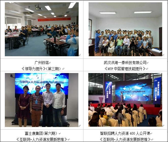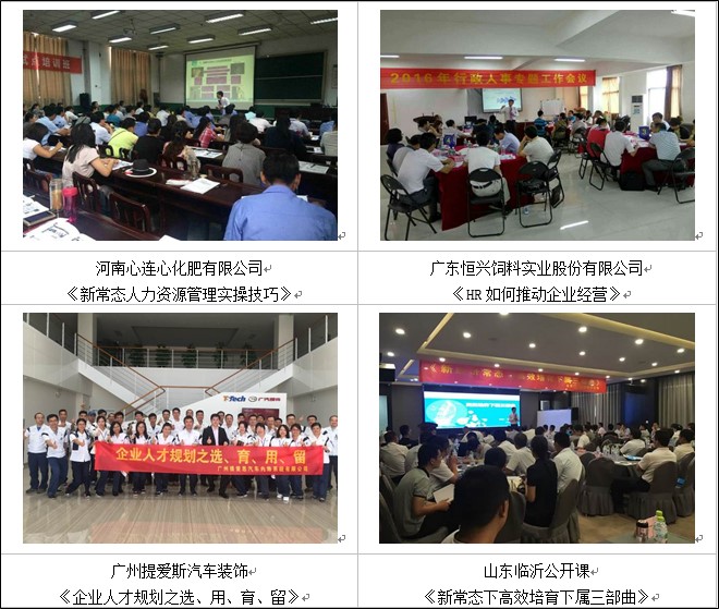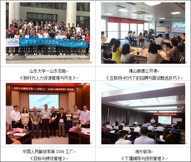 楊老師服務(wù)的客戶遍布北京、天津、上海、深圳、廣州、成都、南京、杭州、武漢、鄭州、沈陽、哈爾濱、長春、長沙、西藏、蘭州、銀川、福州等地200以上企業(yè),為中核工業(yè)集團(tuán)、三星中國、中國移動、中國電信、中國聯(lián)通、中鐵建工集團(tuán)、中國重汽、美的集團(tuán)、中國郵政、中國郵儲、中通通訊、中國建設(shè)銀行、中國工商銀行、中國農(nóng)業(yè)銀行、中信銀行、柳工集團(tuán)、陽光保險(xiǎn)、華美集團(tuán)、中通通訊、惠豐機(jī)電、建滔化工集團(tuán)、金威啤酒集團(tuán)、富士康集團(tuán)、美的集團(tuán)、巴士集團(tuán)、重慶電工、遵義卷煙、共進(jìn)電子、廣州恒大集團(tuán)、廣州粒上皇食品、廣西路橋集團(tuán)、河南心連心化肥、南寧威寧投資集團(tuán)、南沙海城貨代、順豐快遞、廣東省各地人才交流中心、清華大學(xué)國際MBA教學(xué)中心、武漢大學(xué)干部培訓(xùn)中心、華中科技大學(xué)MBA教學(xué)中心、華東理工大學(xué)培訓(xùn)中心、蘭州大學(xué)研究生院、河北工業(yè)大學(xué)、廈門大學(xué)、上海交通大學(xué)、西南交通大學(xué)干部培訓(xùn)中心等多家高校EMBA班授課和多家大中型企事業(yè)單位進(jìn)行中、高層領(lǐng)導(dǎo)加力與管理技能、人力資源管理技能及職業(yè)素養(yǎng)提升、陽光心態(tài)培訓(xùn)超700余場次。