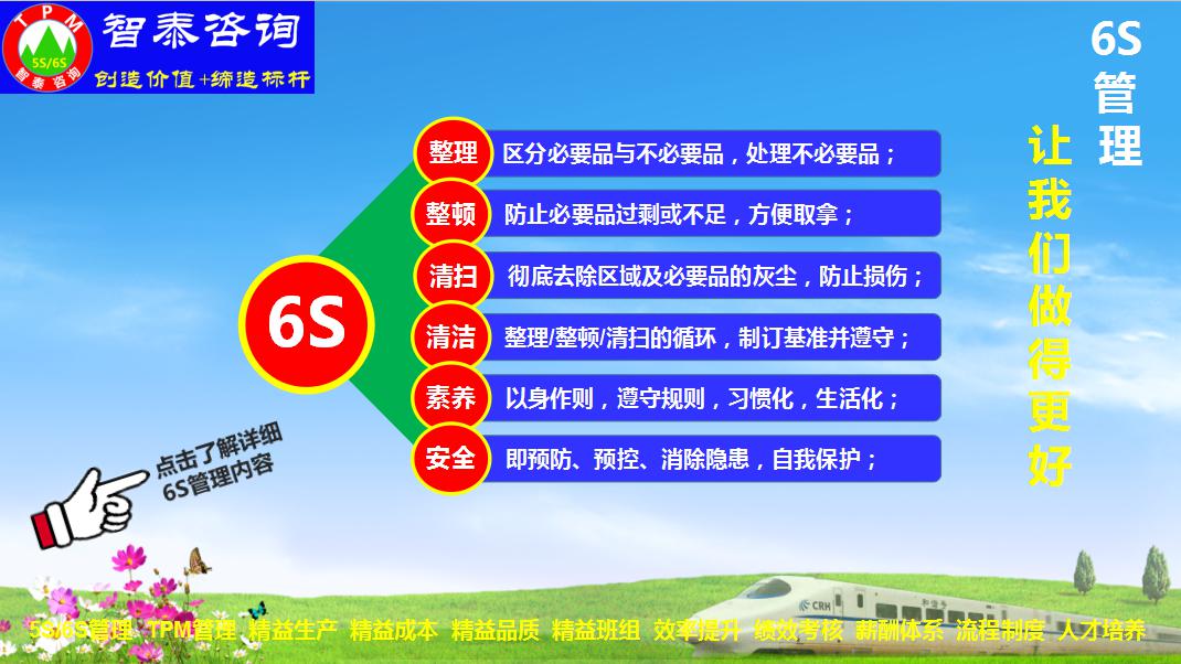目前我們大眾所了解的6S管理是一種企業(yè)的基礎(chǔ)管理模式,是企業(yè)5S管理的升級(jí)版,6S管理即是整理(SEIRI),整頓(SEITON),清掃(SEISO),清潔(SEIKETSU),素養(yǎng)(SHITSUKE),安全(SECURITY)。6S和5S管理一樣最早興起于日本企業(yè),現(xiàn)已流行于全世界的企業(yè),6S管理做好優(yōu)秀企業(yè)必須進(jìn)行的一種管理方法,但不僅要求改變企業(yè)的環(huán)境,也提高了企業(yè)的效率,質(zhì)量,安全,士氣,也降低了企業(yè)的生產(chǎn)成本,縮短企業(yè)的產(chǎn)品的交貨期,可以這么說,6S管理能全面提升企業(yè)綜合競爭力。